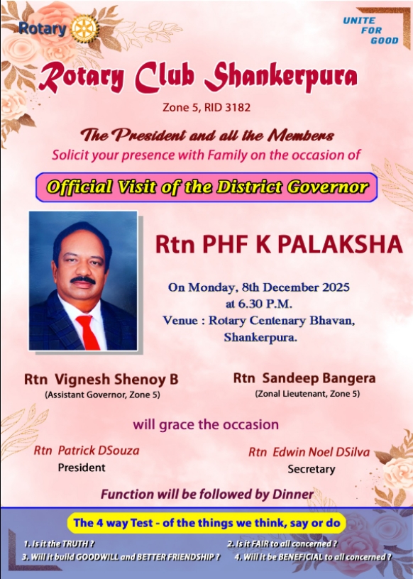 Official Visit of District Governor Rtn. MPHF. K. Palaksha is on Monday, 08th December, 2025 @ 6.30 pm. Rotary Club Shankerpura, district 3182, Zone 5, at Rotary Centenary Bhavana Shankerpura. Kaup Taluq. Udupi district.
