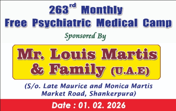 Rotary Club Shankerpura will be Organising 263rd monthly Free Psychiatric medical Camp on Sunday 1st February 2026 from 09.00am to 01.30pm at Rotary Centenary Bhavana Shankarpura. Sponcer is Mr. Louis Martis and Family. (U. A. E.). S/O Late Maurice and Monica Martis, Market road, Shankarpura.